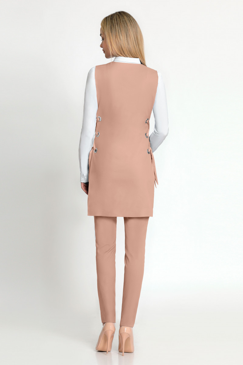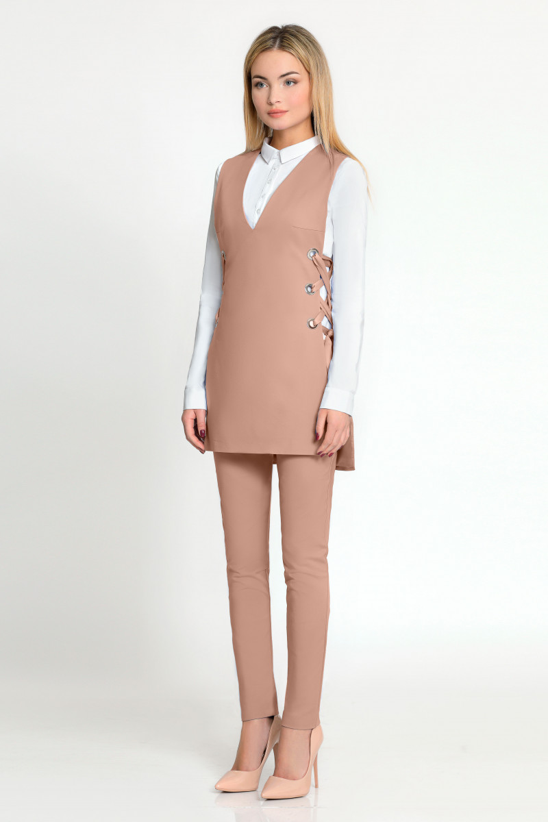 Жилет из хлопковой ткани с эластаном. Перед короче спинки. По переду глубокий V- образный вырез горловины. По бокам металлические люверсы, со шнуровкой широкой атласной лентой. На подкладке.