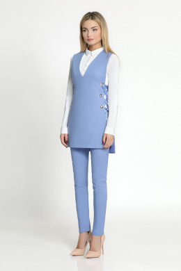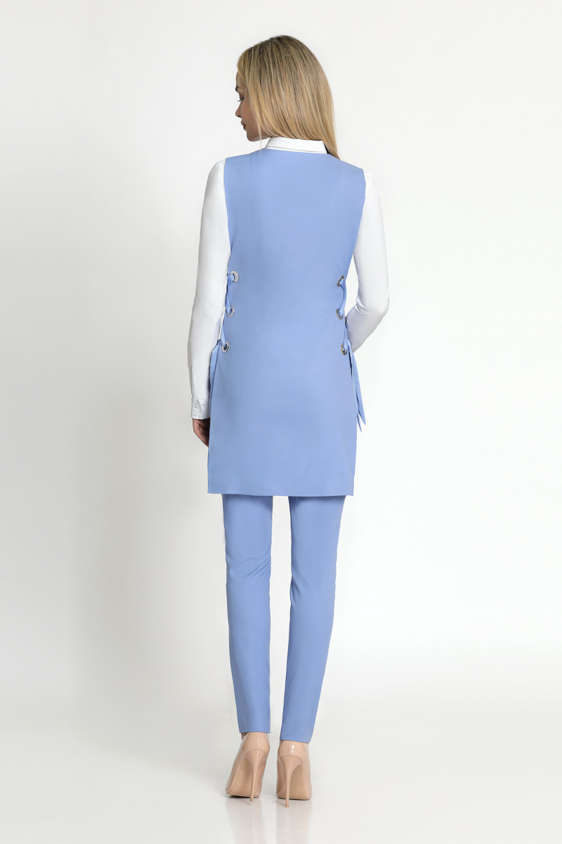 Жилет из хлопковой ткани с эластаном. Перед короче спинки. По переду глубокий V- образный вырез горловины. По бокам металлические люверсы, со шнуровкой широкой атласной лентой. На подкладке.