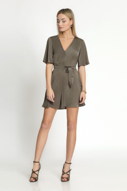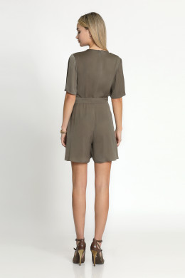 Комбинезон из тонкой, струящейся ткани. Короткий, свободного покроя. Отрезной по линии талии, на резинке. С глубоким V-образным вырезом горловины по переду. Рукав короткий, расширенный. Застежка на потайную молнию в среднем шве спинки. Комбинезон дополняется широким поясом из основной ткани.