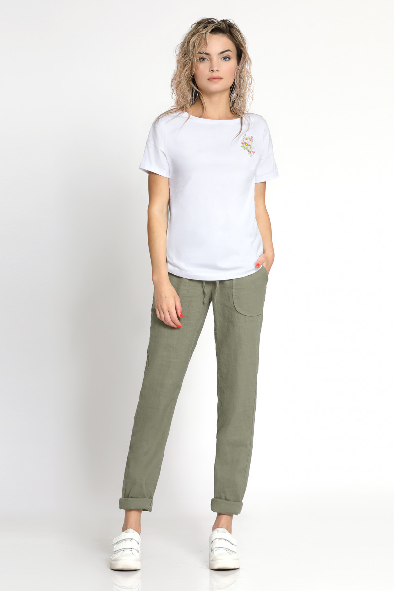 Майка из хлопкового трикотажа. Прямого, слегка расширенного силуэта. С коротким рукавом. С вышивкой по переду. Отличный вариант для летних ежедневных образов.