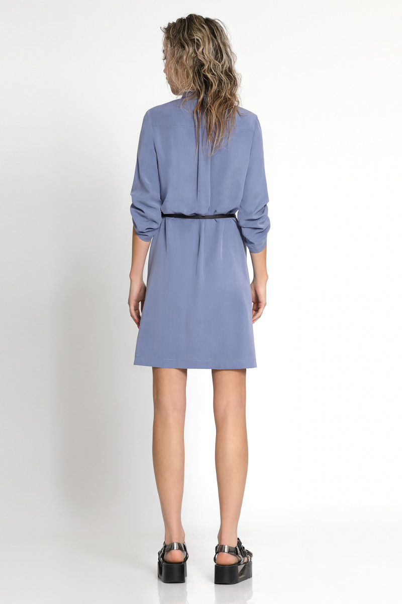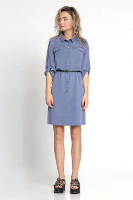 Платье из вискозной ткани с эффектом «варки». Прямого, слегка расширенного силуэта. С воротником на стойке. Рукав ¾, с патой. Застежка по переду на петли-пуговицы. Спереди на уровне линии груди накладные карманы с клапаном, клапан декорирован металлической молнией. Платье дополняется съемным поясом контрастного цвета.