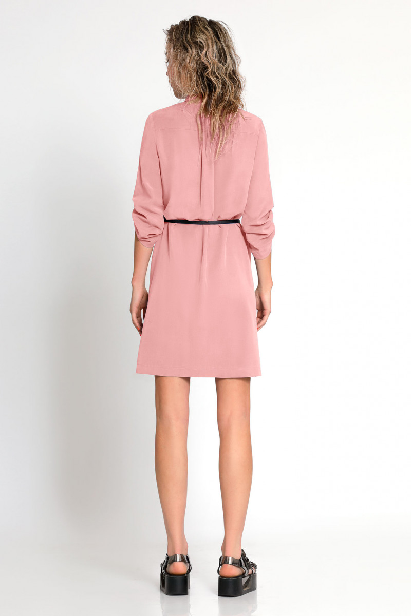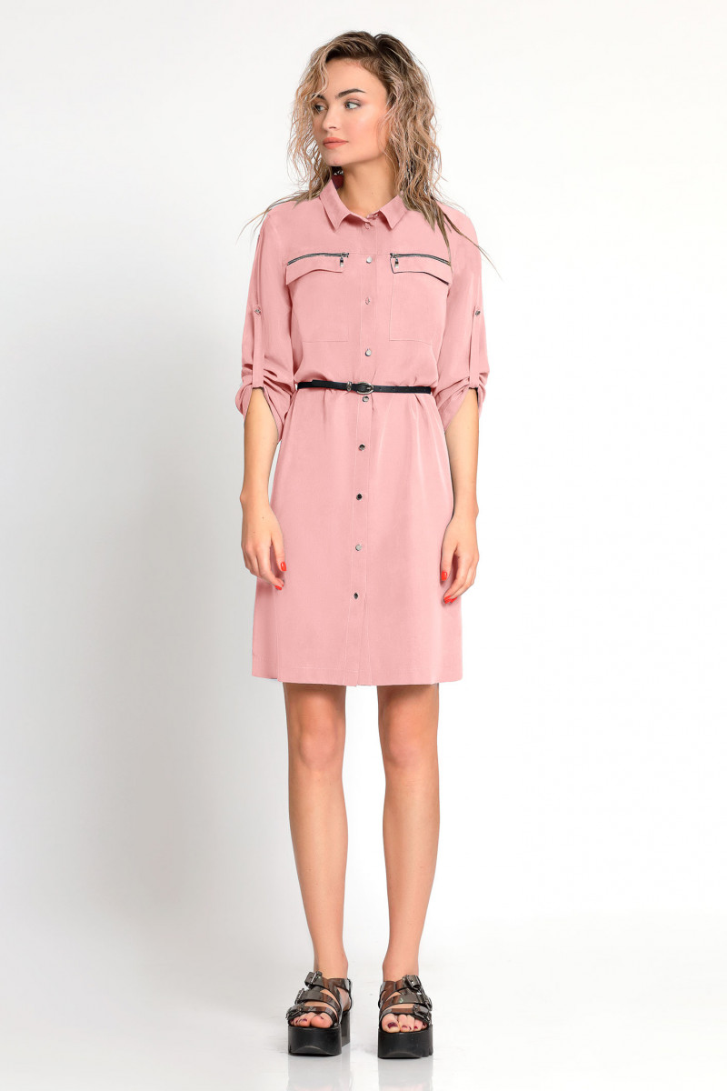 Платье из вискозной ткани с эффектом «варки». Прямого, слегка расширенного силуэта. С воротником на стойке. Рукав ¾, с патой. Застежка по переду на петли-пуговицы. Спереди на уровне линии груди накладные карманы с клапаном, клапан декорирован металлической молнией. Платье дополняется съемным поясом контрастного цвета.