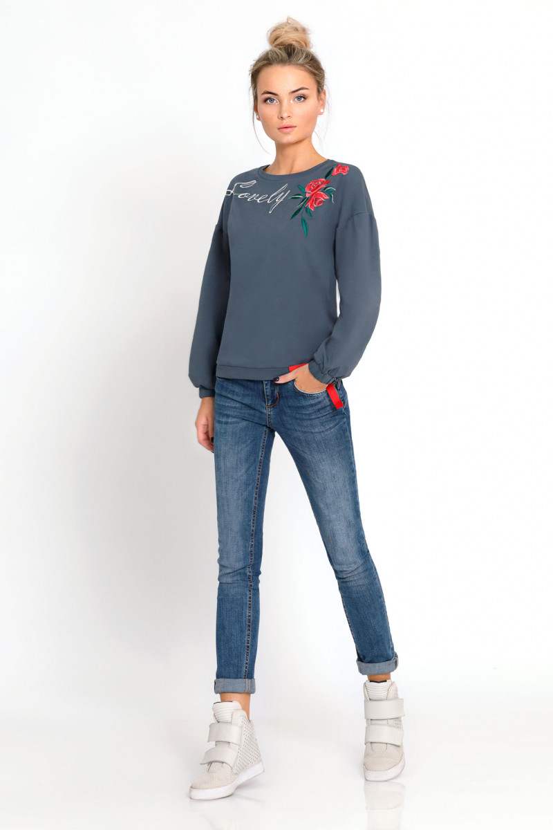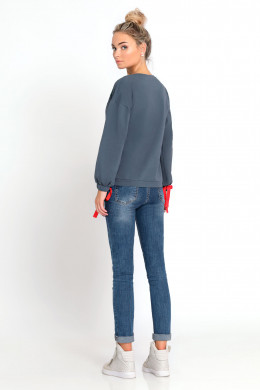 Джемпер из хлопкового трикотажа. Прямого силуэта. С длинными, расширенными рукавами, со сборкой по нижнему и верхнему срезу, с манжетой. В манжету вставлена лента контрастного цвета. Спереди вышивка.