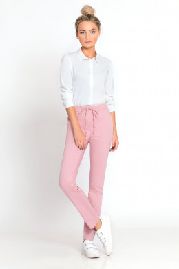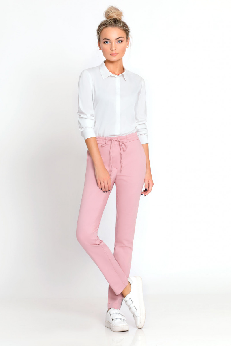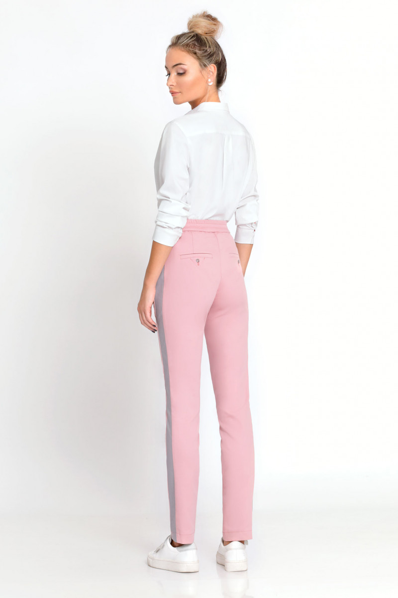Брюки из хлопковой ткани с эластаном . В спортивном стиле с небольшими акцентами, прямые, узкие. С лампасами контрастного цвета. В пояс вставлена резинка Сзади два карамана-обманки, вход оформлен в рамку. По переду два функциональных кармана в боковых швах