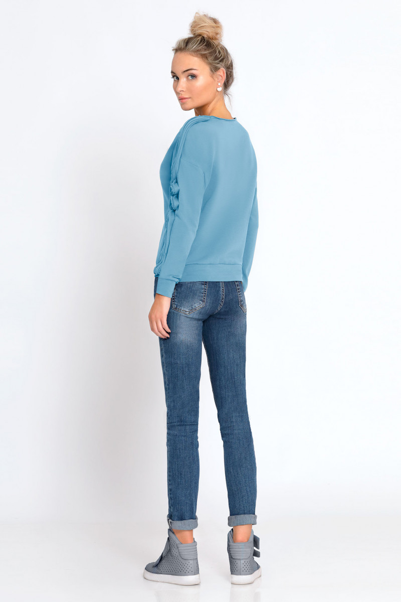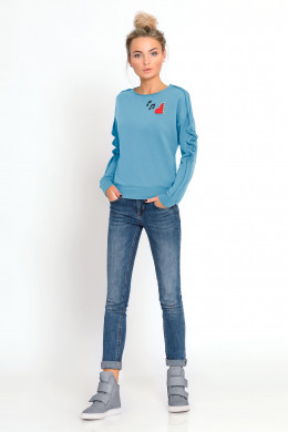 Оригинальный джемпер выполнен из качественного хлопкового трикотажа. Рукава украшены качественной декоративной отделкой. На груди пришивные броши в виде нот, а также цветная печать на музыкальную тему.