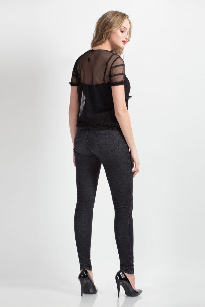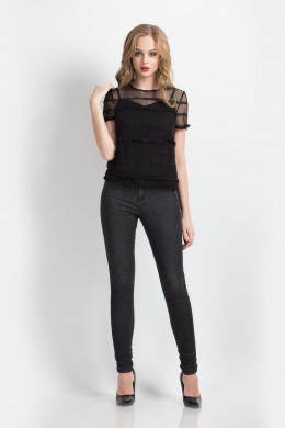 Комплект. Верхняя блузка из сетки. С овальной формы горловиной. С коротким рукавом, с рюшей. По переду горизонтальные подрезы, в подрезы вставлены рюши. Перед декорирован настрачной кружевной тесьмой в тон основной ткани. По низу изделия рюша. Нижний топ из ткани черного цвета. Свободного силуэта. Топ на регулируемых бретелях. Спереди для идеальной посадки введены нагрудные вытачки.