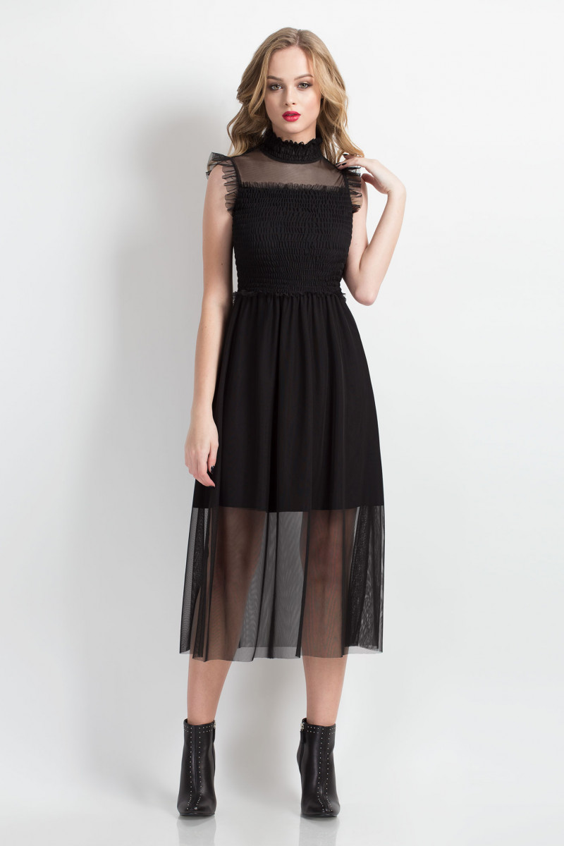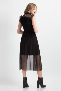 Платье из сетки. С воротником стойкой, с со сборкой на венгерку. С рукавом «крылышко» со сборкой. По переду и спинке кокетка, в шов под кокетку вставлены рюши. Нижняя часть переда и спинки со сборкой на венгерку. Отрезное по линии талии, в рез вставлена рюша. Юбка пышная, со сборкой по верхнему срезу. На подкладке. Застежка на потайную молнию в боковом шве.