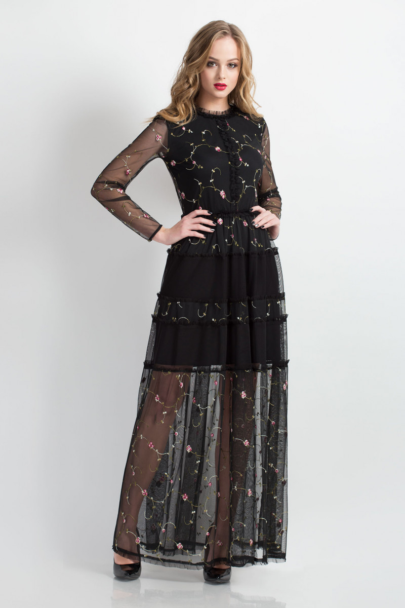 Длинное платье из сетки с вышивкой. Горловина овальной формы, декорирована рюшей. Рукав длинный. По переду вертикально настрочена рюша. Платье отрезное по талии, рез декорирован рюшей. Юбка с горизонтальными подрезами, декорированные рюшей. По юбке вставки из однотонной сетки. Застежка на потайную молнию в среднем шве спинки. Перед и юбка на подкладке.