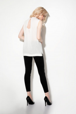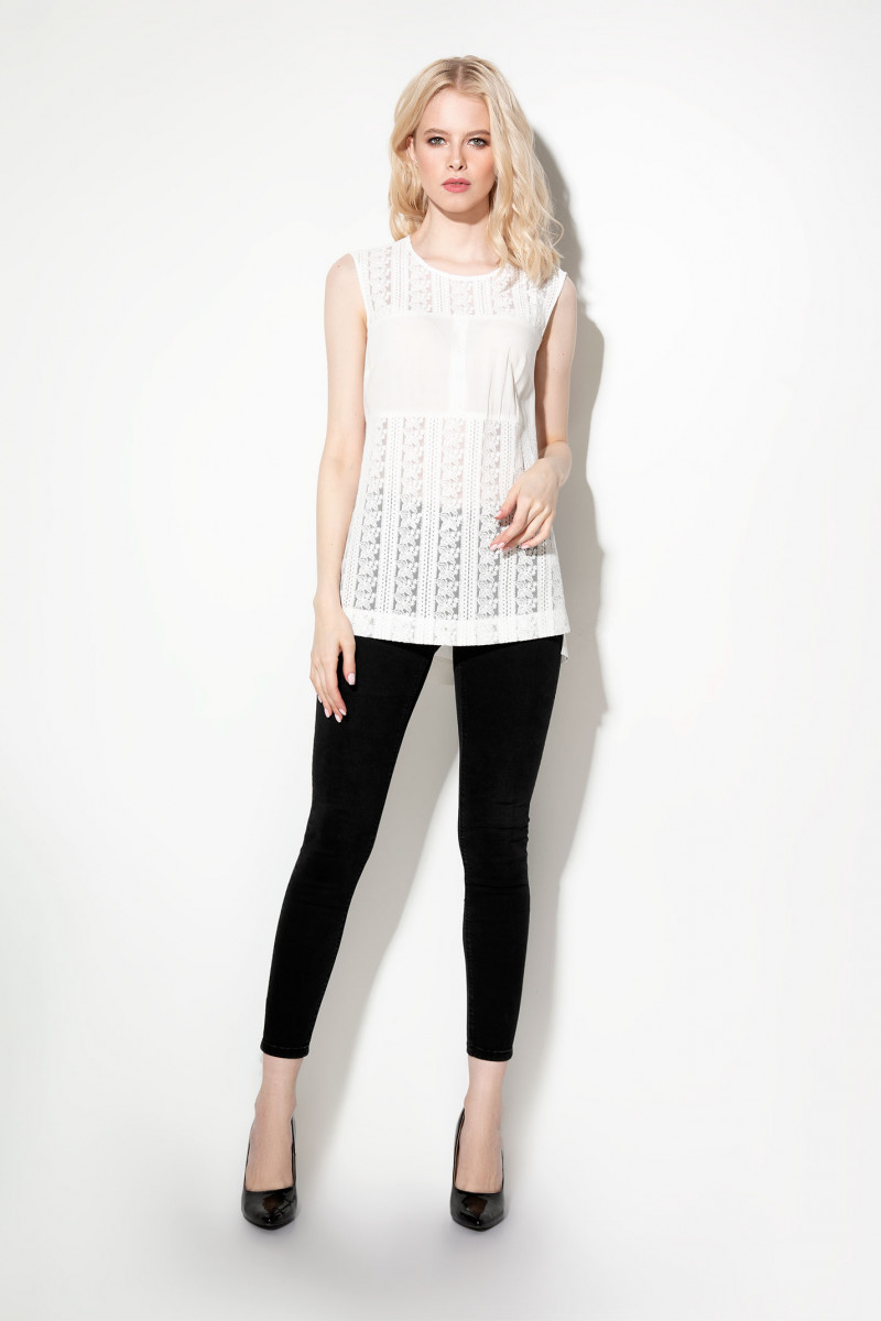 Лёгкая ,летняя ,кружевная спереди блузка прекрасно дополнитлетний повседневный гардероб деловой девушки с утончённым вкусом.Блузка без рукава.Силуэт прямой.Вырез горловины круглый.Спереди на уровне груди выполнена днталь из основной ткани,образующая лиф. Спинка вся выполнена из основной ткани и имеент интересный конструктивный элемент в виде складок,образующих треугольный вырез .Застёжка выполнена сверху на навесную петлю и пуговицу на ножке.Спинка удлинена относительно переда.По бокам имеются небольшие разрезы.