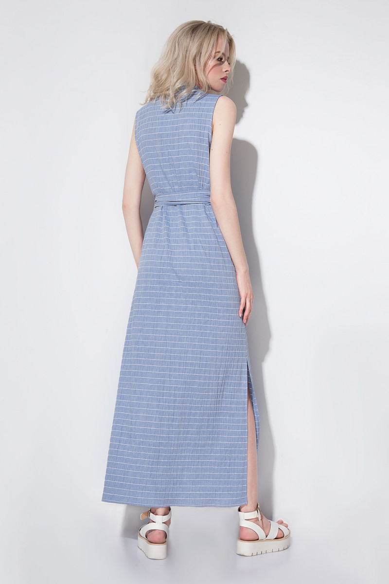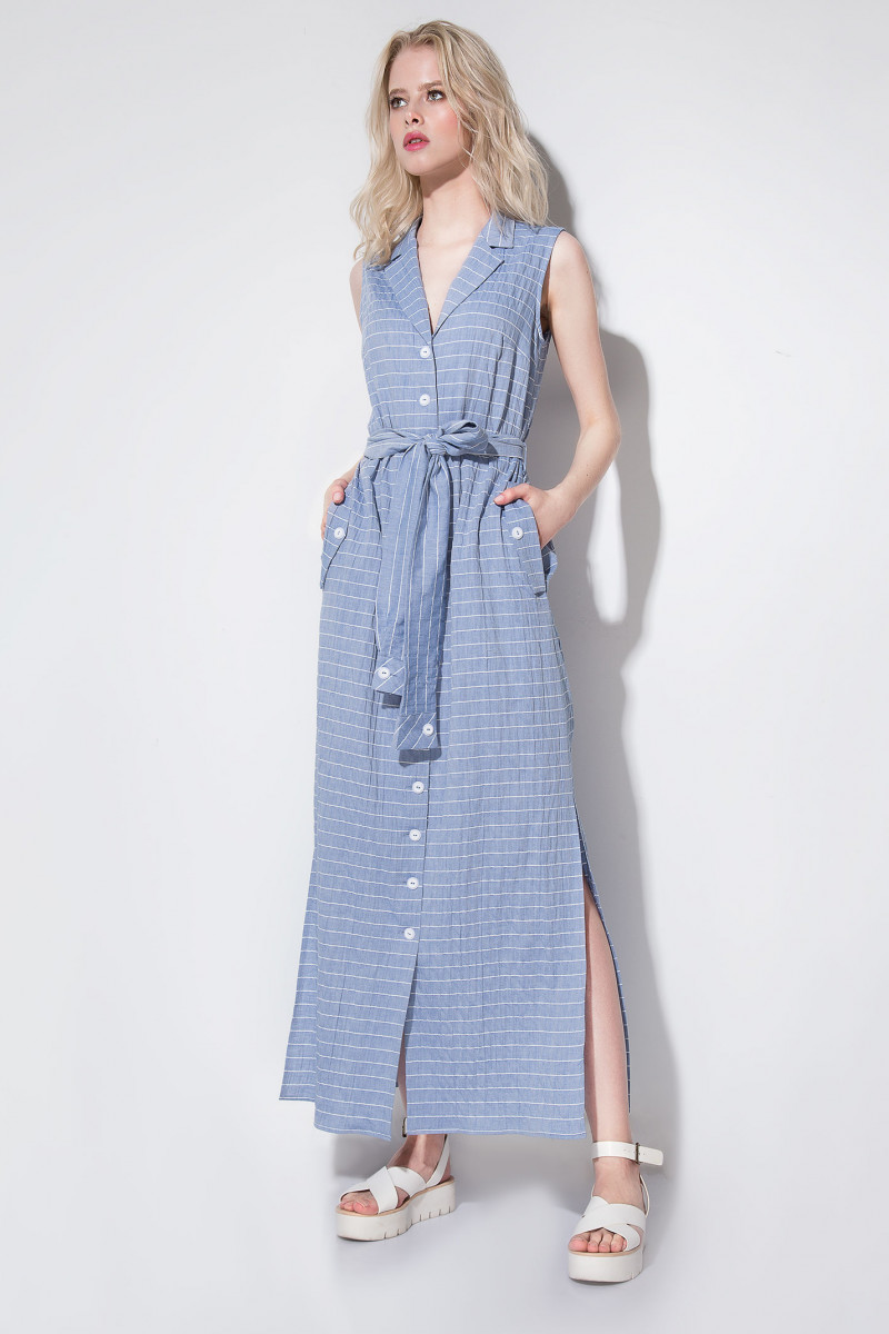 Стильное длинное платье с центральной застёжкой на петли-пуговицы и отложным воротником пиджачного типа наверняка порадует современных модниц,ведь эта модель невероятно стройнит фигуру,а пояс,имитирующий рукава рубашки и завязывающийся спереди,изумительно подчёркивает талию.В боковых швах выполнены внутренние карманы,декорированные клапаном с пуговицей. Платье без рукавов и по бокам имеет пикантные разрезы.Идеальная посадка на фигуре и качество мягкого хлопкового полотна с нейтральным принтом в виде тонкой полосы многим придутся по душе.