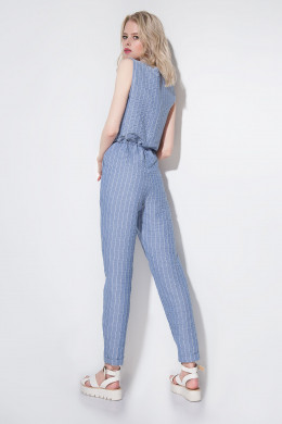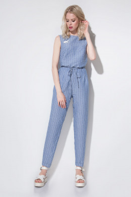 Стильный, хлопковый ,летний комбинезон без рукавов прямого силуэта .Лаконичный , простой,удобный и одновременно ультра-современный он наверняка будет радовать свою обладательницу всё лето,как вариант одежды на каждый день.Вырез горловины круглый.Застёжка сзади в среднем шве на потайную молнию.В боковых швах оформлены внутренние удобные карманы.На уровне талии выполнен горизонтальный рез,в котором оформлены складки в брюках по переду и притачная планка с кулисой вокруг талии ,завязываюшейся спереди. По низу брюк выполнен отложной цельнокроеный манжет. По лифу комбинезон декорирован пришивной пластиковой брошью.