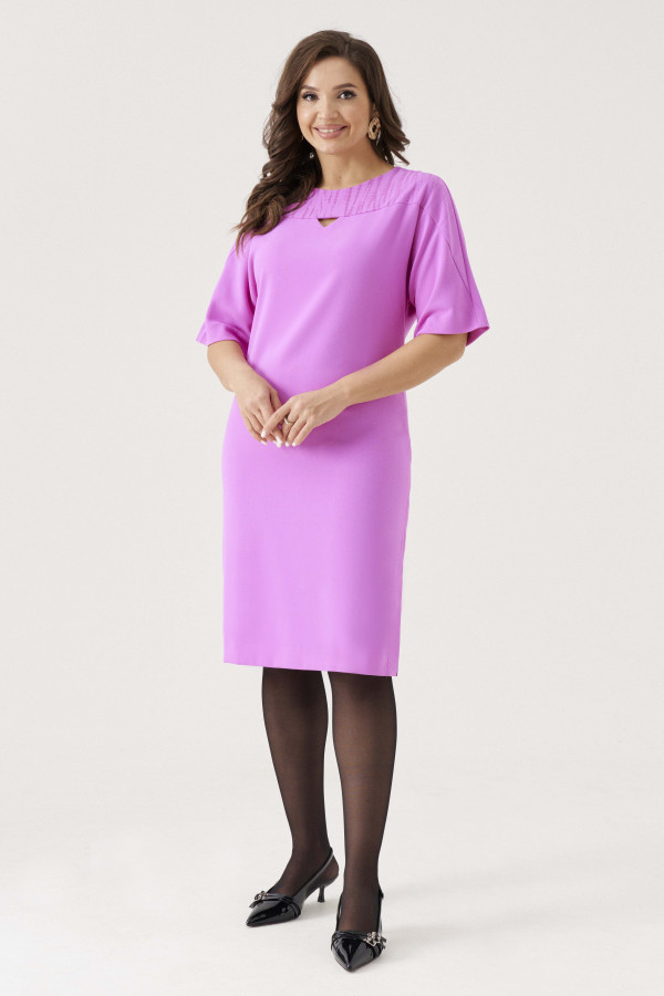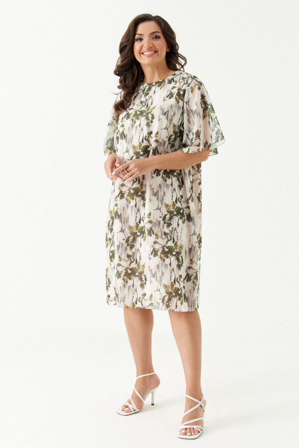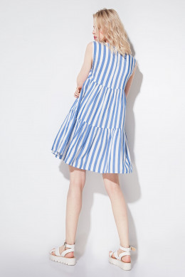 Платье расширенного силуэта. С горизонтальными подрезами ниже линии груди и ниже линии талии. Средняя и нижняя детали платья со сборкой по верхнему срезу. Горловина овальная. Платье без рукавов. Застежка на потайную молнию в среднем шве спинки.