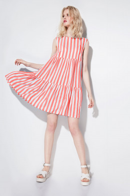 Платье расширенного силуэта. С горизонтальными подрезами ниже линии груди и ниже линии талии. Средняя и нижняя детали платья со сборкой по верхнему срезу. Горловина овальная. Платье без рукавов. Застежка на потайную молнию в среднем шве спинки.