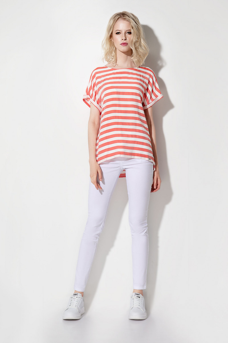 Стильная лаконичная вискозная блузка с рисунком в полоску, которая отлично сочетается с различными вещами вашего гардероба. Блузка полуприлегающего силуэта, с круглым вырезом горловины, рукава цельнокроенные с отложными манжетами.