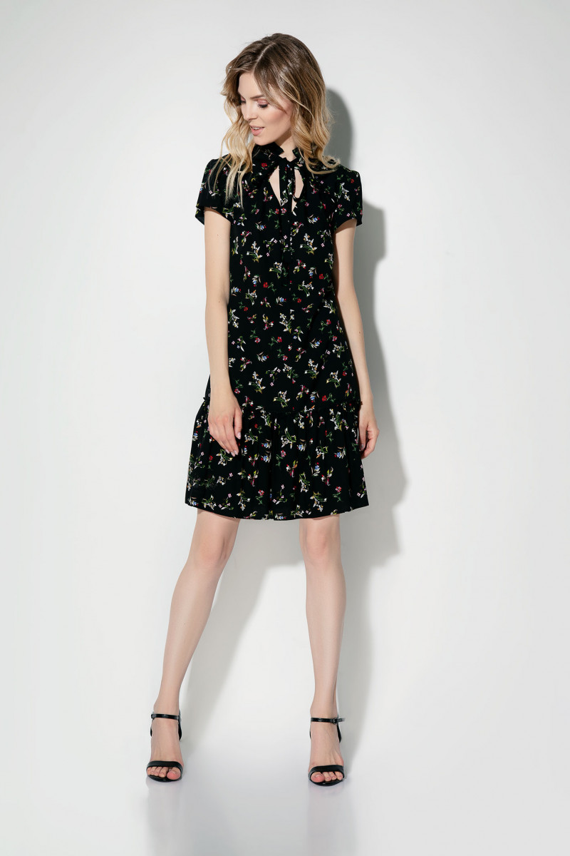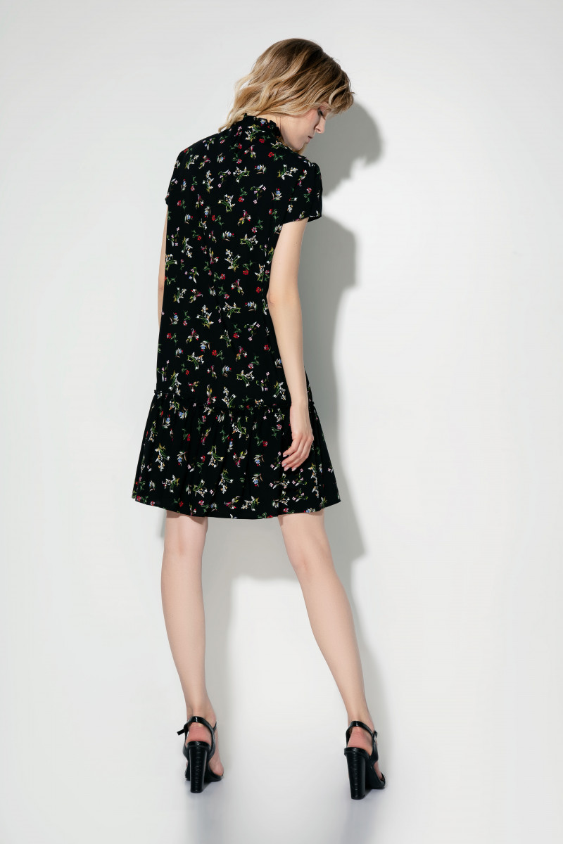 Маленькое черное платье говорит само за себя. Платье из вискозы, рисунок в романтический мелкий цветок. Свободного силуэта, горловина фигурной формы, воротник- стойка с рюшей, по центру от горловины навесные петли и пуговицы. По переду кокетки в шов вставлена рюша, по низу изделия волан. Рукава короткие со сборкой. Разнообразить лук помогут яркие аксессуары.