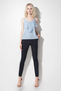 Молодежный нарядный топ из легкой струящейся ткани. Топ прямого силуэта на бретелях. Бретели с регуляторами. По спинки резинка. По переду топ дополнен воланом, который придает нарядность данной модели. Такой топ отлично подойдет под любой жакет для офиса или просто с любимыми джинсами в жаркие летние дни.