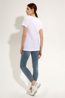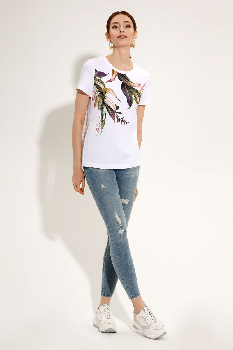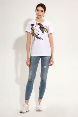 Лёгкий и аккуратный джемпер - отличная база для оригинального лука. Джемпер выполнен из хлопка, декорирован авторской печатью . Джемпер прямого силуэта ,с кругрым вырезом горловины. Спинка лаконичная. Рукава втачные короткие. Отлично смотрится в сочетании , джинс, шорт, кюлотов.